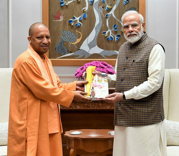 उत्तर प्रदेश के मुख्य्मंत्री श्री योगी आदित्यनाथ जी माननीय प्रधानमंत्री श्री नरेन्द्र मोदी जी को सरोज बाला की पुस्तक 'रामायण की कहानी, विज्ञान की जुबानी’ भेंट करते हुए: 30 नवम्बर 2019