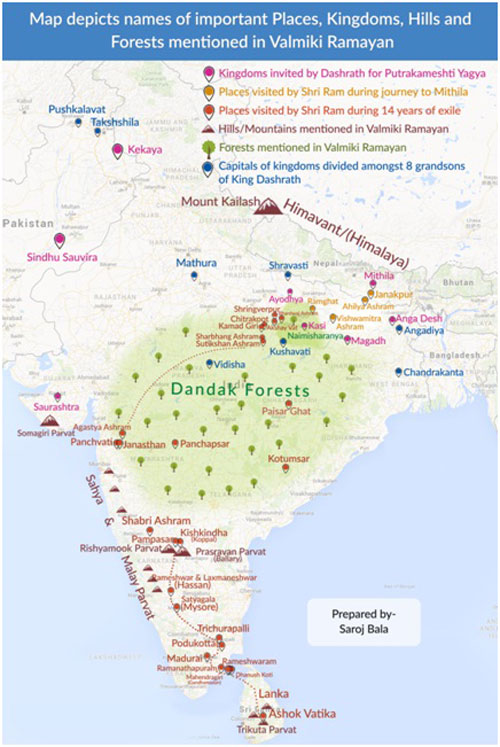 Map depicts eight capital cities, developed by Shri Ram for the eight princes. These have been shown in blue color with their modern day locations, plotted using GPS. Limited Excavations have been carried out at all these eight places.